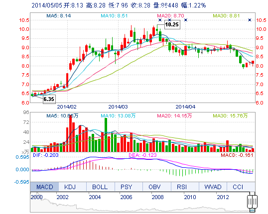 | 今 開: | 8.13 | 成交量: | 8.64萬手 | 振 幅: | 3.91% |