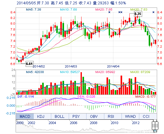 | 今 開: | 7.30 | 成交量: | 2.93萬手 | 振 幅: | 2.73% |