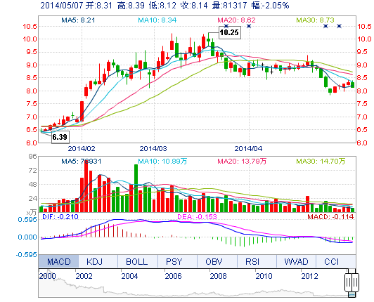 | 今 開: | 8.31 | 成交量: | 8.13萬手 | 振 幅: | 3.25% |
