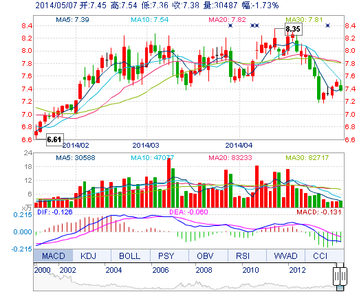 | 今 開: | 7.45 | 成交量: | 3.05萬手 | 振 幅: | 2.40% |