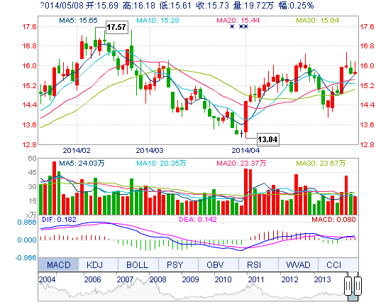 | 今 開: | 15.69 | 成交量: | 19.72萬手 | 振 幅: | 3.63% |