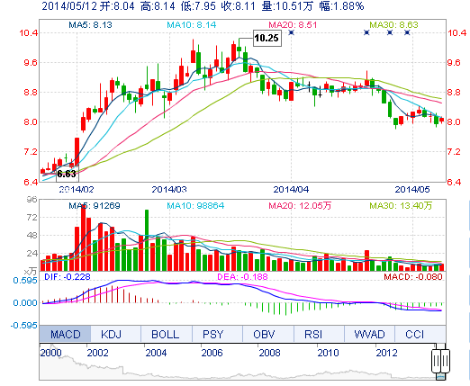 今開: 8.04 成交量: 10.51萬(wan) 手 振幅: 2.39% 最高: 8.14 成交額: 8485.77萬(wan) 元 換手率: 1.18% 最低: 7.95 總市值: 72.27億(yi) 市淨率: 2.70 昨收: 7.96 流通市值:...