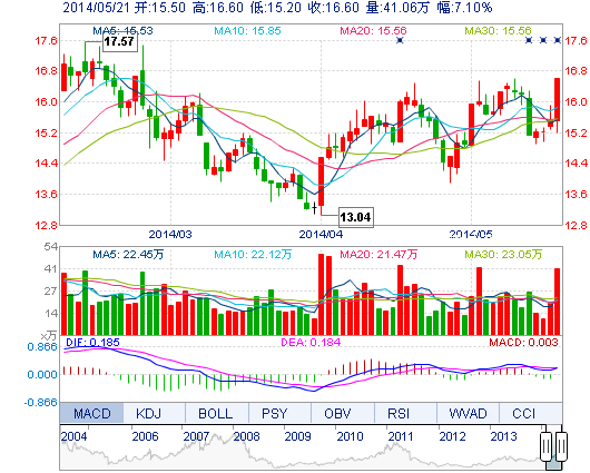 | 最 高: | 16.60 | 成交額: | 6.61億元 | 換手率: | 4.30% |