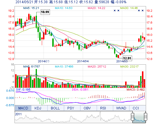 | 今 開: | 15.38 | 成交量: | 5.96萬手 | 振 幅: | 3.55% |