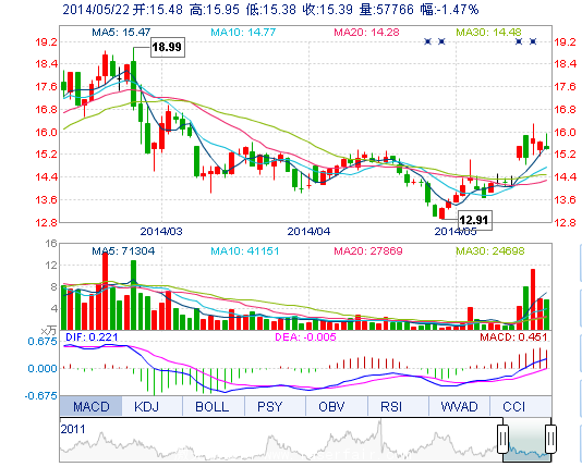 | 今 開: | 15.48 | 成交量: | 5.78萬手 | 振 幅: | 3.65% |