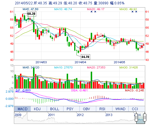 今開: 48.35 成交量: 3.09萬(wan) 手 振幅: 2.25% 最高: 49.29 成交額: 1.51億(yi) 元 換手率: 1.07% 最低: 48.20 總市值: 145.11億(yi) 市淨率: 8.73 昨收: 48.34 流通市值...