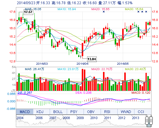 今開: 16.33 成交量: 27.11萬(wan) 手 振幅: 3.43% 最高: 16.78 成交額: 4.48億(yi) 元 換手率: 2.84% 最低: 16.22 總市值: 175.18億(yi) 市淨率: 4.75 昨收: 16.35 流通市值...
