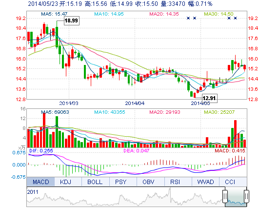 | 今 開: | 15.19 | 成交量: | 3.35萬手 | 振 幅: | 3.70% |