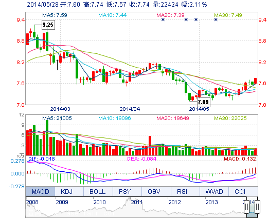 今開: 7.60 成交量: 2.24萬(wan) 手 振幅: 2.24% 最高: 7.74 成交額: 1722.56萬(wan) 元 換手率: 0.82% 最低: 7.57 總市值: 22.06億(yi) 市淨率: 3.44 昨收: 7.58 流通市值: ...