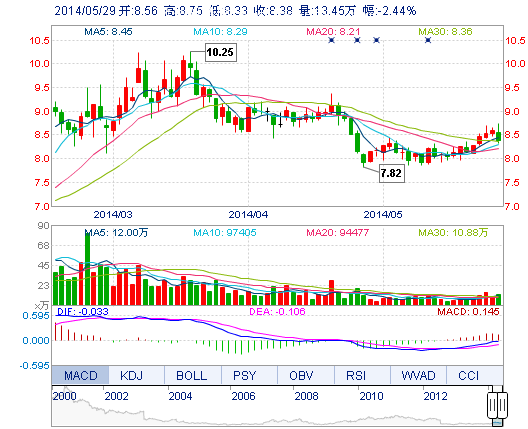 | 今 開: | 8.56 | 成交量: | 13.45萬手 | 振 幅: | 4.89% |