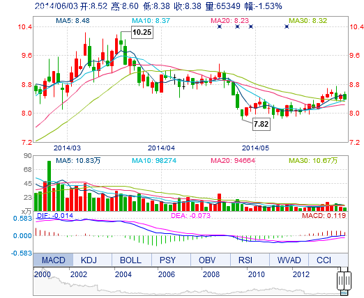 今開: 8.52 成交量: 6.53萬(wan) 手 振幅: 2.59% 最高: 8.60 成交額: 5543.32萬(wan) 元 換手率: 0.73% 最低: 8.38 總市值: 74.68億(yi) 市淨率: 2.79 昨收: 8.51 流通市值: ...