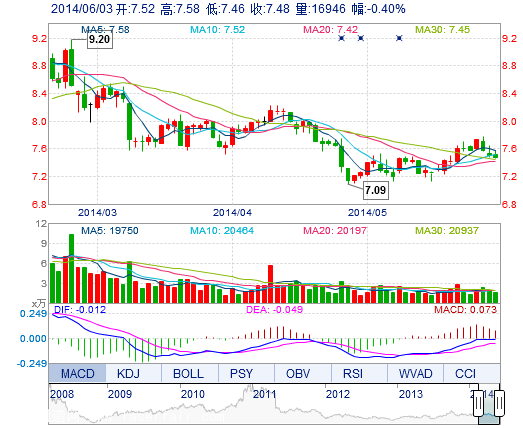 | 今 開: | 7.52 | 成交量: | 1.69萬手 | 振 幅: | 1.60% |