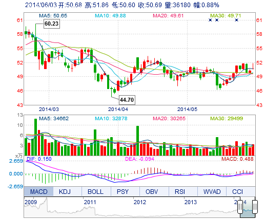 今開: 50.68 成交量: 3.62萬(wan) 手 振幅: 2.51% 最高: 51.86 成交額: 1.85億(yi) 元 換手率: 1.26% 最低: 50.60 總市值: 150.88億(yi) 市淨率: 9.08 昨收: 50.25 流通市值...