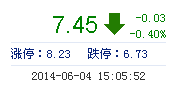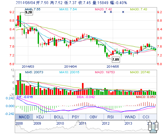 今開: 7.50 成交量: 1.58萬(wan) 手 振幅: 2.01% 最高: 7.52 成交額: 1179.03萬(wan) 元 換手率: 0.58% 最低: 7.37 總市值: 21.23億(yi) 市淨率: 3.31 昨收: 7.48 流通市值: ...