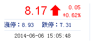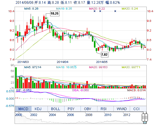 | 今 開: | 8.14 | 成交量: | 12.28萬手 | 振 幅: | 2.09% |
