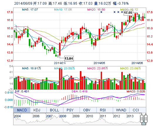| 今 開: | 17.09 | 成交量: | 16.02萬手 | 振 幅: | 2.97% |