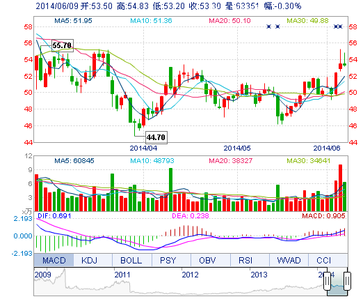 今開: 53.50 成交量: 6.34萬(wan) 手 振幅: 3.05% 最高: 54.83 成交額: 3.42億(yi) 元 換手率: 2.20% 最低: 53.20 總市值: 158.65億(yi) 市淨率: 9.55 昨收: 53.46 流通市值...