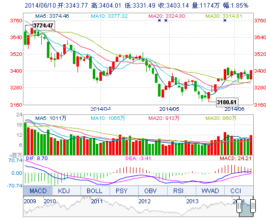 今開: 3343.77 最高: 3404.01 昨收: 3341.30 最低: 3331.49 成交量: 1173.90萬(wan) 手 振幅: 2.17% 成交額: 177.74億(yi) 元