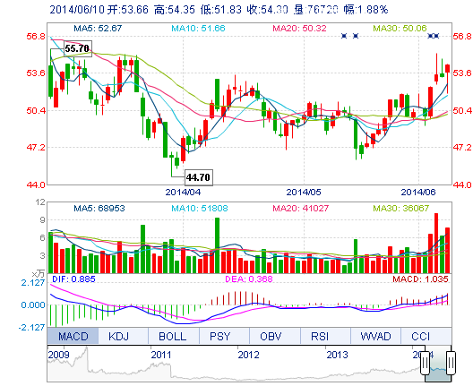 今開: 53.66 成交量: 7.67萬(wan) 手 振幅: 4.73% 最高: 54.35 成交額: 4.08億(yi) 元 換手率: 2.66% 最低: 51.83 總市值: 161.63億(yi) 市淨率: 9.73 昨收: 53.30 流通市值...