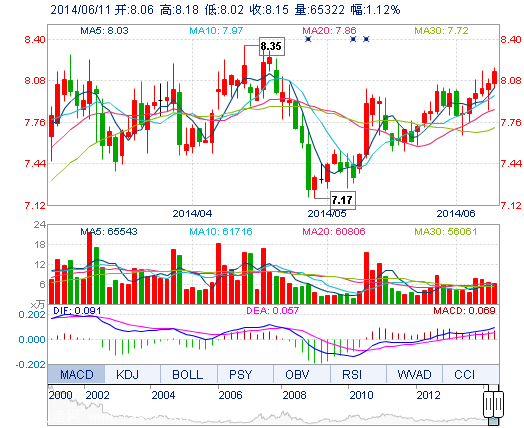 | 今 開: | 8.06 | 成交量: | 6.53萬手 | 振 幅: | 1.99% |
