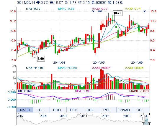 | 今 開: | 9.73 | 成交量: | 5.20萬手 | 振 幅: | 3.47% |