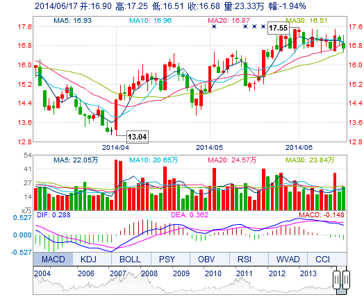 今開: 16.90 成交量: 23.33萬(wan) 手 振幅: 4.35% 最高: 17.25 成交額: 3.93億(yi) 元 換手率: 2.44% 最低: 16.51 總市值: 176.06億(yi) 市淨率: 4.78 昨收: 17.01 流通市值...