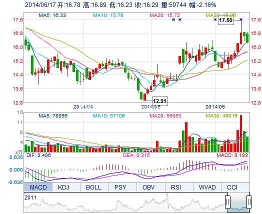 | 今 開: | 16.78 | 成交量: | 5.97萬手 | 振 幅: | 3.96% |