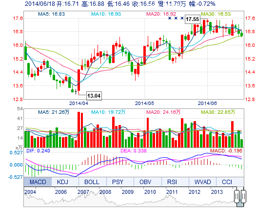 今開: 16.71 成交量: 11.79萬(wan) 手 振幅: 2.52% 最高: 16.88 成交額: 1.96億(yi) 元 換手率: 1.23% 最低: 16.46 總市值: 174.79億(yi) 市淨率: 4.74 昨收: 16.68 流通市值...