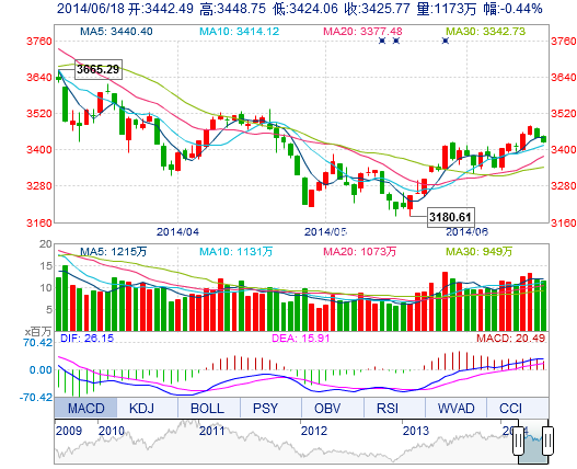 今開: 3442.49 最高: 3448.75 昨收: 3441.00 最低: 3424.06 成交量: 1173.03萬(wan) 手 振幅: 0.72% 成交額: 155.17億(yi) 元