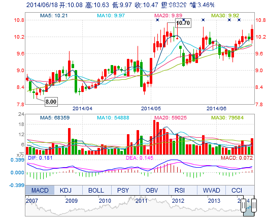 今開: 10.08 成交量: 9.83萬(wan) 手 振幅: 6.52% 最高: 10.63 成交額: 1.01億(yi) 元 換手率: 4.94% 最低: 9.97 總市值: 20.86億(yi) 市淨率: 4.21 昨收: 10.12 流通市值: ...