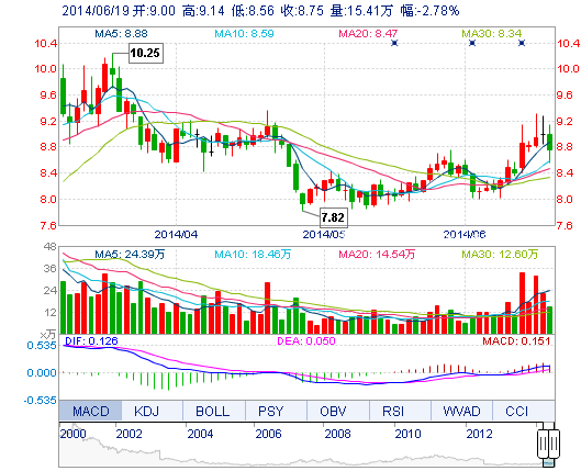 | 今 開: | 9.00 | 成交量: | 15.41萬手 | 振 幅: | 6.44% |