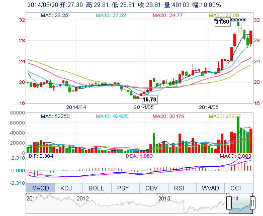 | 今 開: | 27.30 | 成交量: | 4.91萬手 | 振 幅: | 11.07% |