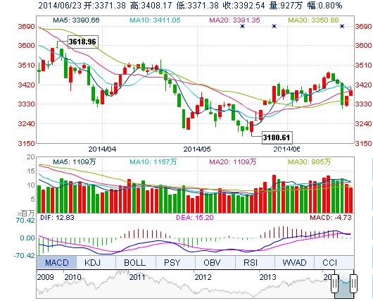 今開: 3371.38 最高: 3408.17 昨收: 3365.56 最低: 3371.38 成交量: 926.83萬(wan) 手 振幅: 1.09% 成交額: 127.11億(yi) 元