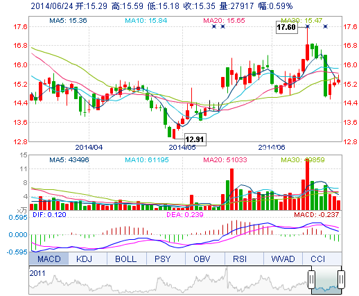 | 今 開: | 15.29 | 成交量: | 2.79萬手 | 振 幅: | 2.69% |
