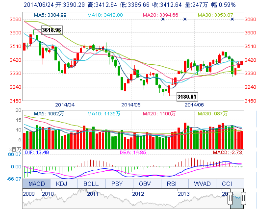 今開: 3390.29 最高: 3412.64 昨收: 3392.54 最低: 3385.67 成交量: 946.85萬(wan) 手 振幅: 0.80% 成交額: 134.07億(yi) 元