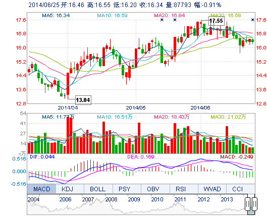 今開: 16.46 成交量: 8.78萬(wan) 手 振幅: 2.12% 最高: 16.55 成交額: 1.44億(yi) 元 換手率: 0.92% 最低: 16.20 總市值: 172.48億(yi) 市淨率: 4.68 昨收: 16.49 流通市值...