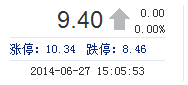 今開: 9.60 成交量: 35.72萬(wan) 手 振幅: 4.36% 最高: 9.77 成交額: 3.41億(yi) 元 換手率: 4.01% 最低: 9.36 總市值: 83.76億(yi) 市淨率: 3.13 昨收: 9.40 流通市值: 83...