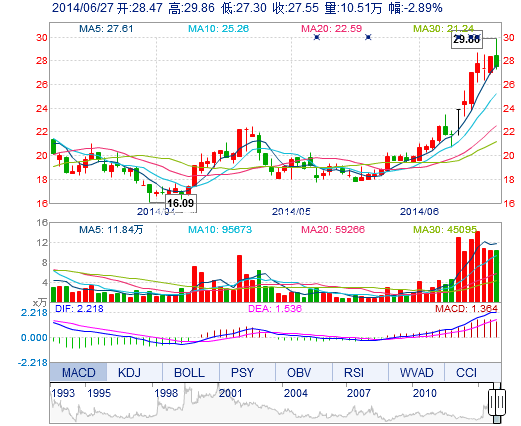 | 今 開: | 28.47 | 成交量: | 10.51萬手 | 振 幅: | 9.02% |