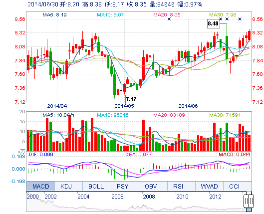 | 今 開: | 8.20 | 成交量: | 8.46萬手 | 振 幅: | 2.54% |
