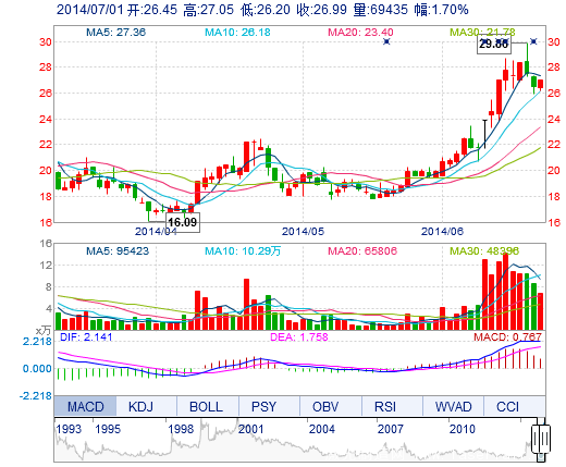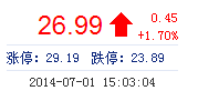今開: 26.45 成交量: 6.94萬(wan) 手 振幅: 3.20% 最高: 27.05 成交額: 1.85億(yi) 元 換手率: 4.00% 最低: 26.20 總市值: 46.88億(yi) 市淨率: 13.55 昨收: 26.54 流通市值...