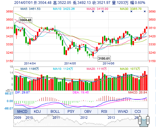 今開: 3504.48 最高: 3522.05 昨收: 3501.08 最低: 3492.13 成交量: 1203.24萬(wan) 手 振幅: 0.85% 成交額: 194.90億(yi) 元