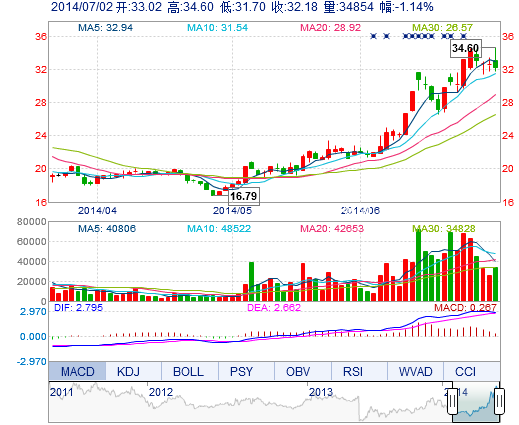 | 最 高: | 34.60 | 成交額: | 1.14億元 | 換手率: | 13.07% |