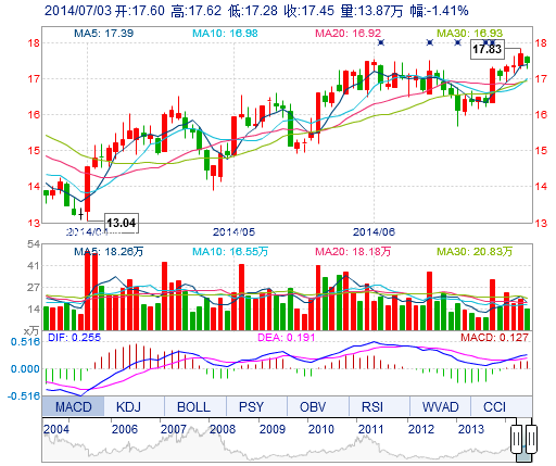| 今 開: | 17.60 | 成交量: | 13.87萬手 | 振 幅: | 1.92% |