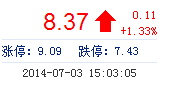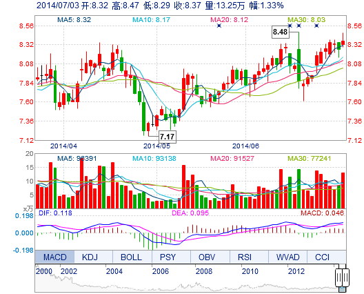 | 今 開: | 8.32 | 成交量: | 13.25萬手 | 振 幅: | 2.18% |