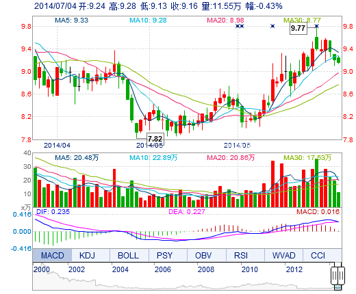 | 今 開: | 9.24 | 成交量: | 11.55萬手 | 振 幅: | 1.63% |