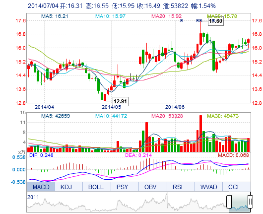 | 今 開: | 16.31 | 成交量: | 5.38萬手 | 振 幅: | 3.69% |