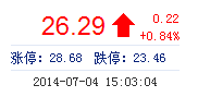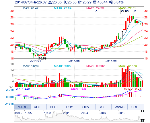 | 今 開: | 26.07 | 成交量: | 4.50萬手 | 振 幅: | 3.26% |