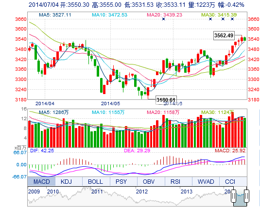 今開: 3550.30 最高: 3555.00 昨收: 3547.99 最低: 3531.53 成交量: 1222.74萬(wan) 手 振幅: 0.66% 成交額: 192.02億(yi) 元