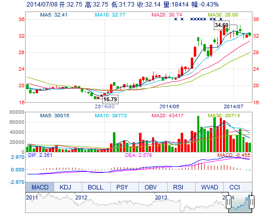 | 今 開: | 32.75 | 成交量: | 1.84萬手 | 振 幅: | 3.16% |