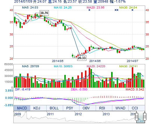 | 今 開: | 24.07 | 成交量: | 2.09萬手 | 振 幅: | 2.46% |